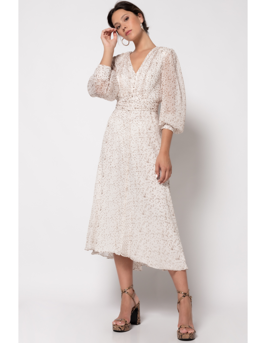 Vestido Máss, de corte midi de muselina estampada animal prints, escote V con botones al tono, manga semitransparente abullonada acabada en puño y falda evasé con abertura central.