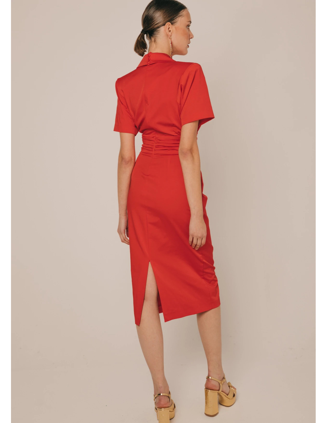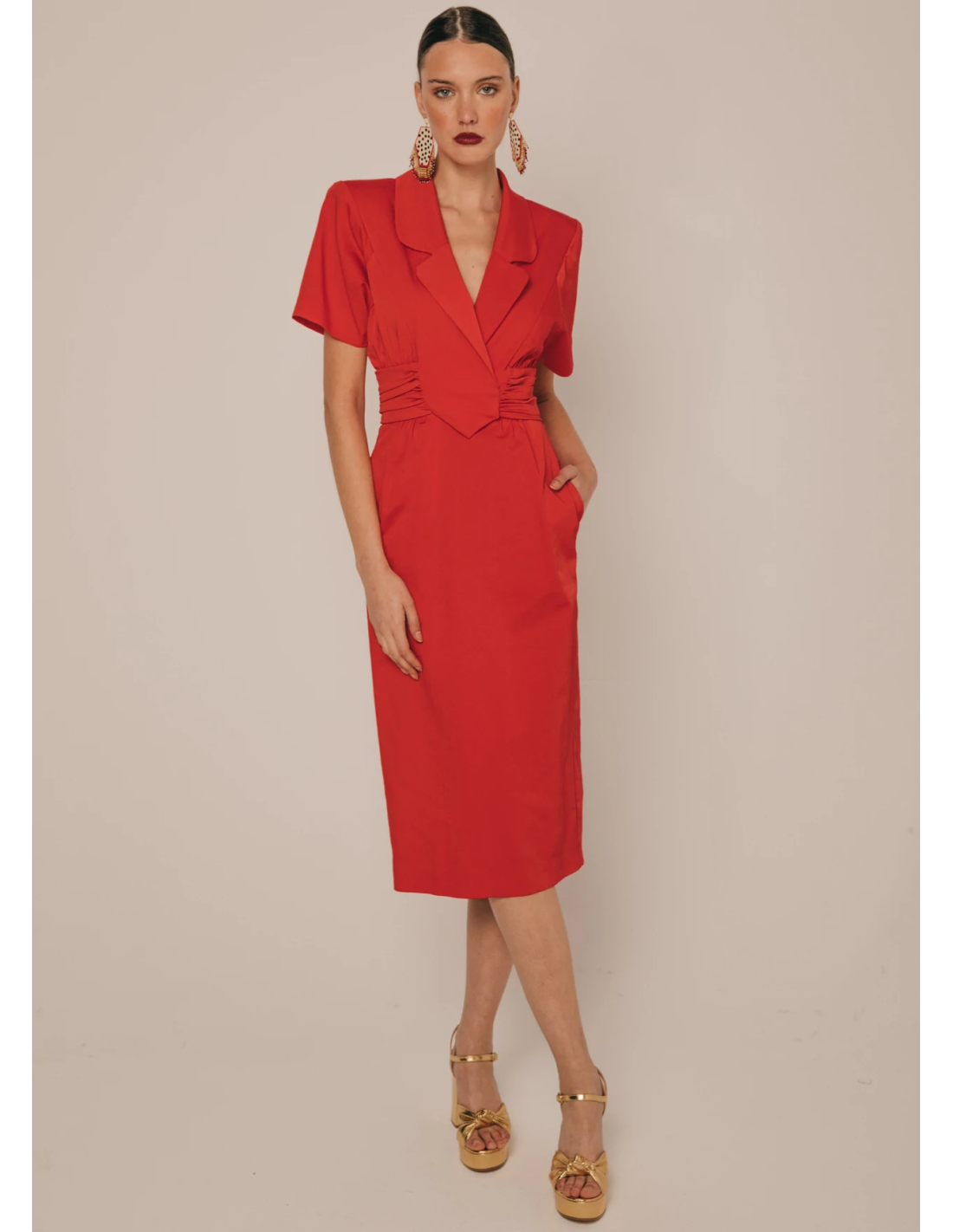 Vestido largo midi con falda brocada de distintos colores, cuerpo de plumetti en negro.