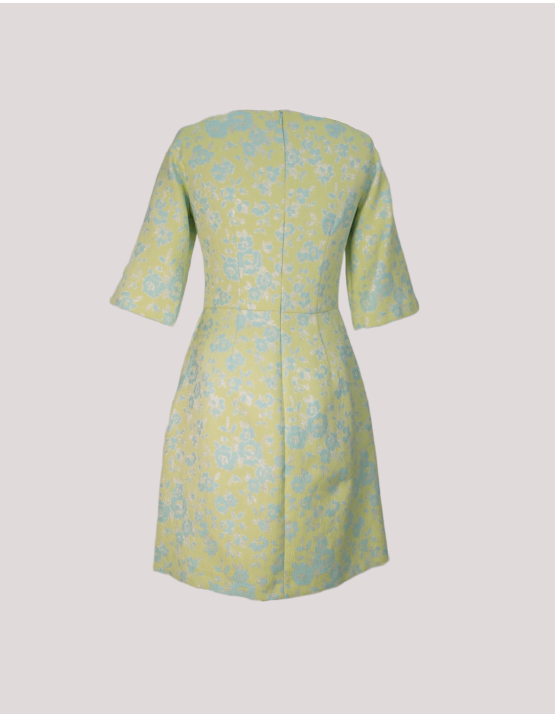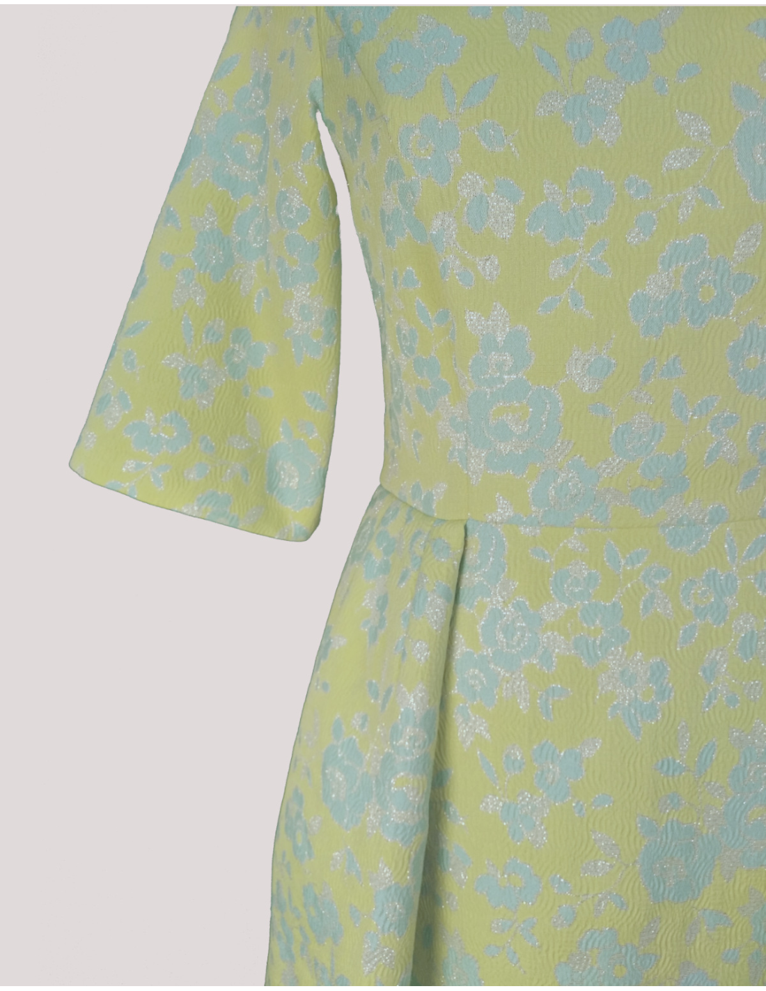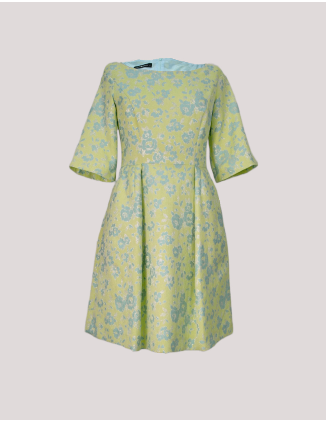 Vestido corto confeccionado en un tejido brocado estampado con un hilo metalizado, escote redondo, manga 3/4 y falda con evasé y monta una pala en cada lateral.