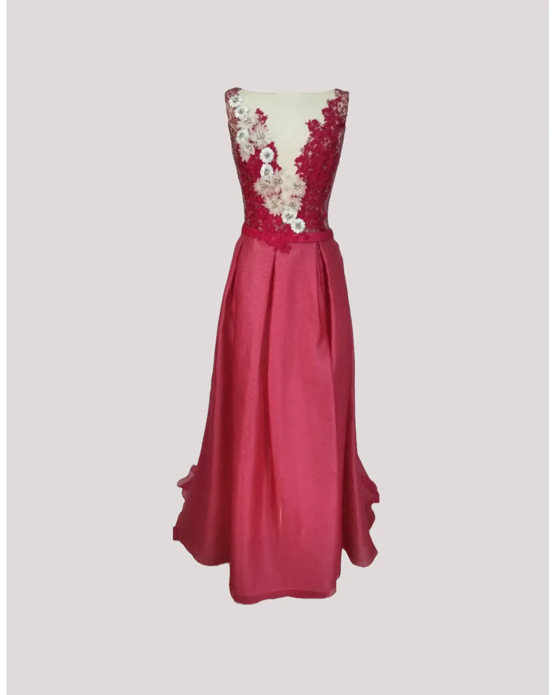Vestido corto en tejido de seda, manga larga acabada en lazos y en el cuello.