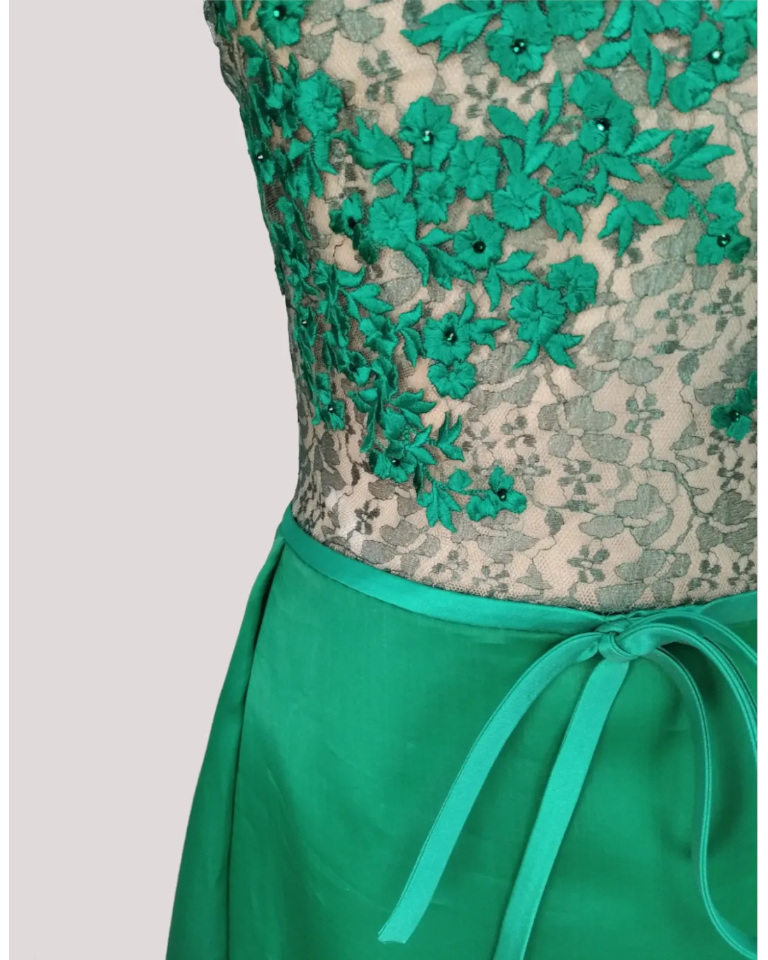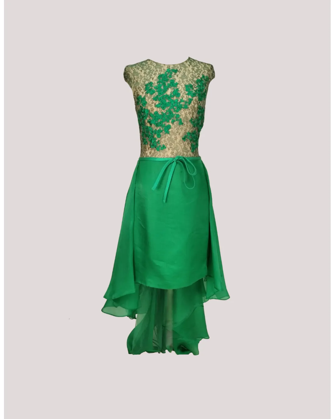 Vestido midi confeccionado en un tejido de seda y de encaje con hombros anchos y encaje de flores en el cuerpo, con lazo en la cintura y cola.