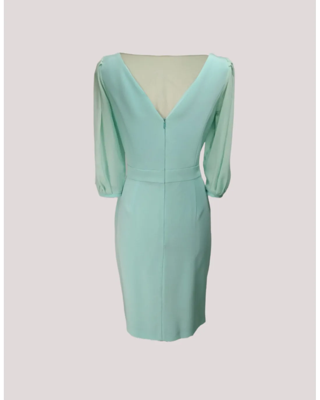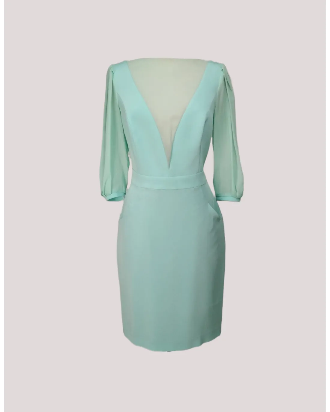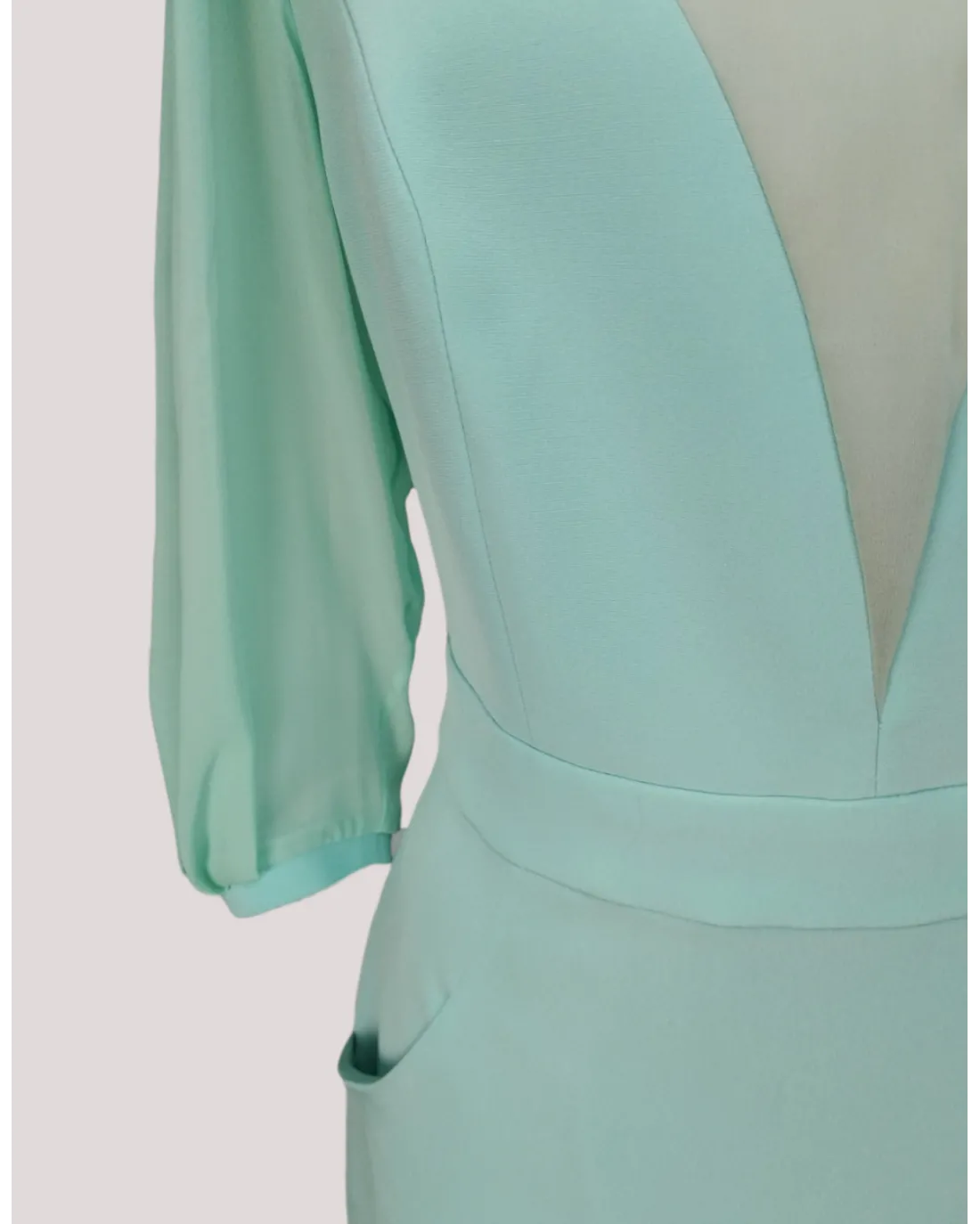 Vestido a media pierna confeccionado en un tejido crepé con escote en V confeccionado en gasa al igual que las mangas bombachas y acabadas en puño con bolsillos en los laterales.