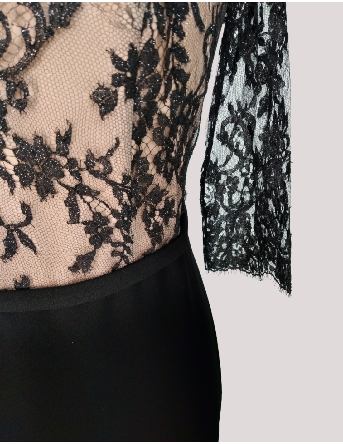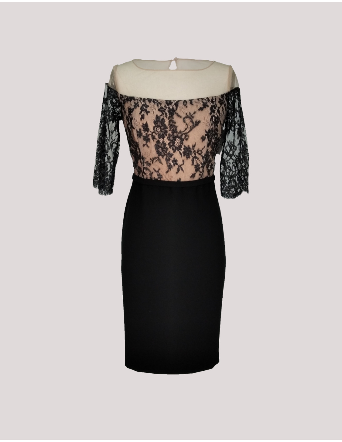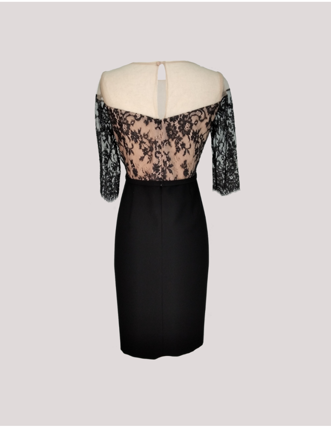 Vestido a media pierna confeccionado en un tejido crepé con escote en V confeccionado en gasa al igual que las mangas bombachas y acabadas en puño con bolsillos en los laterales.