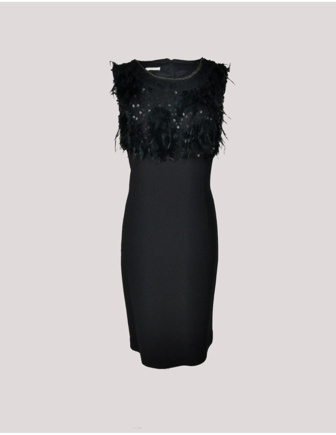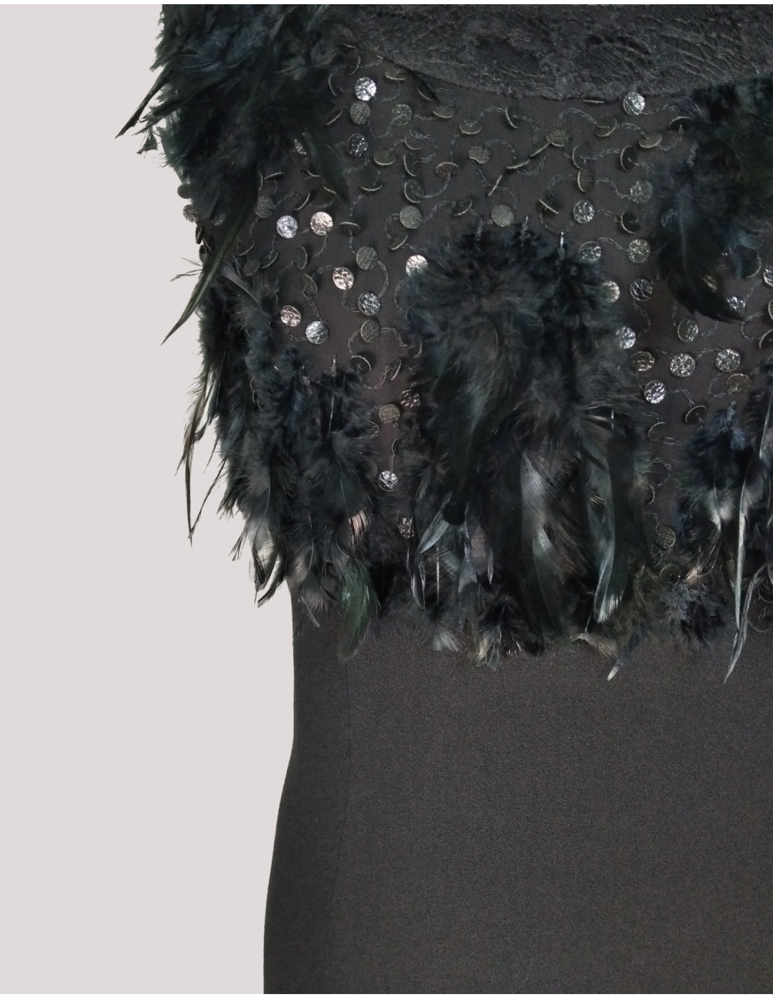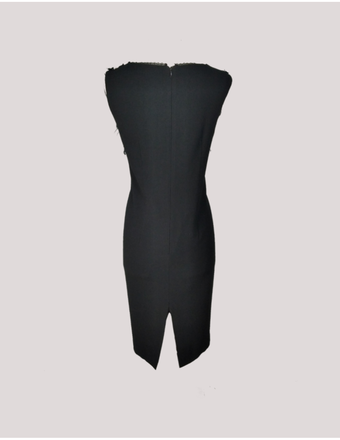 Vestido a media pierna sin mangas con escote redondo y aplique de encaje y plumas en el pecho.