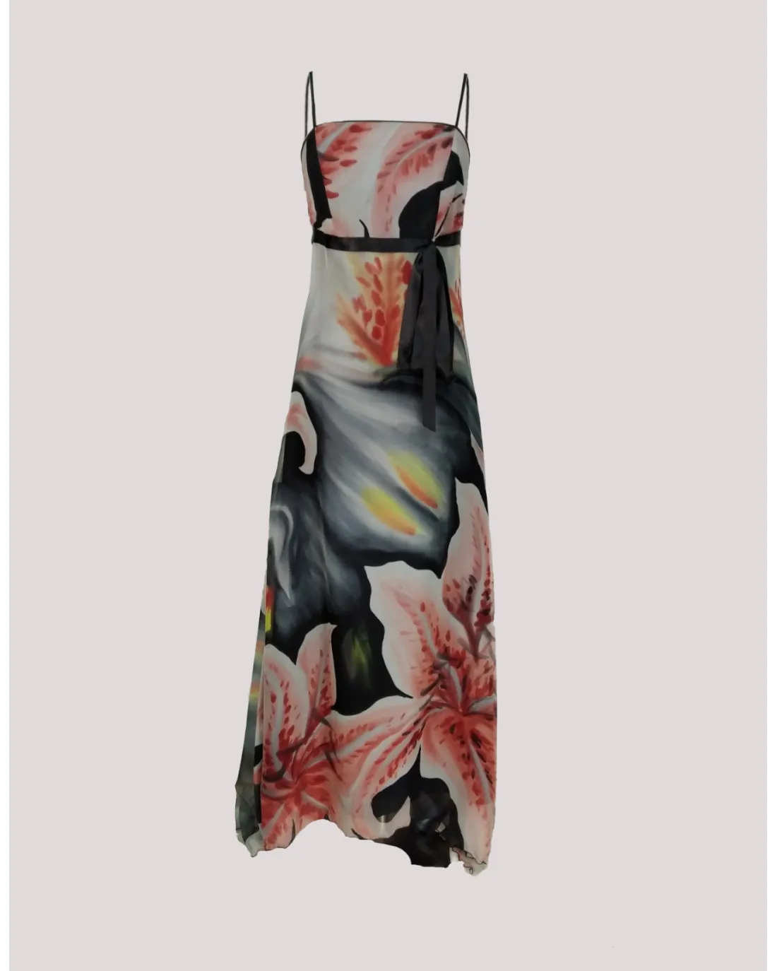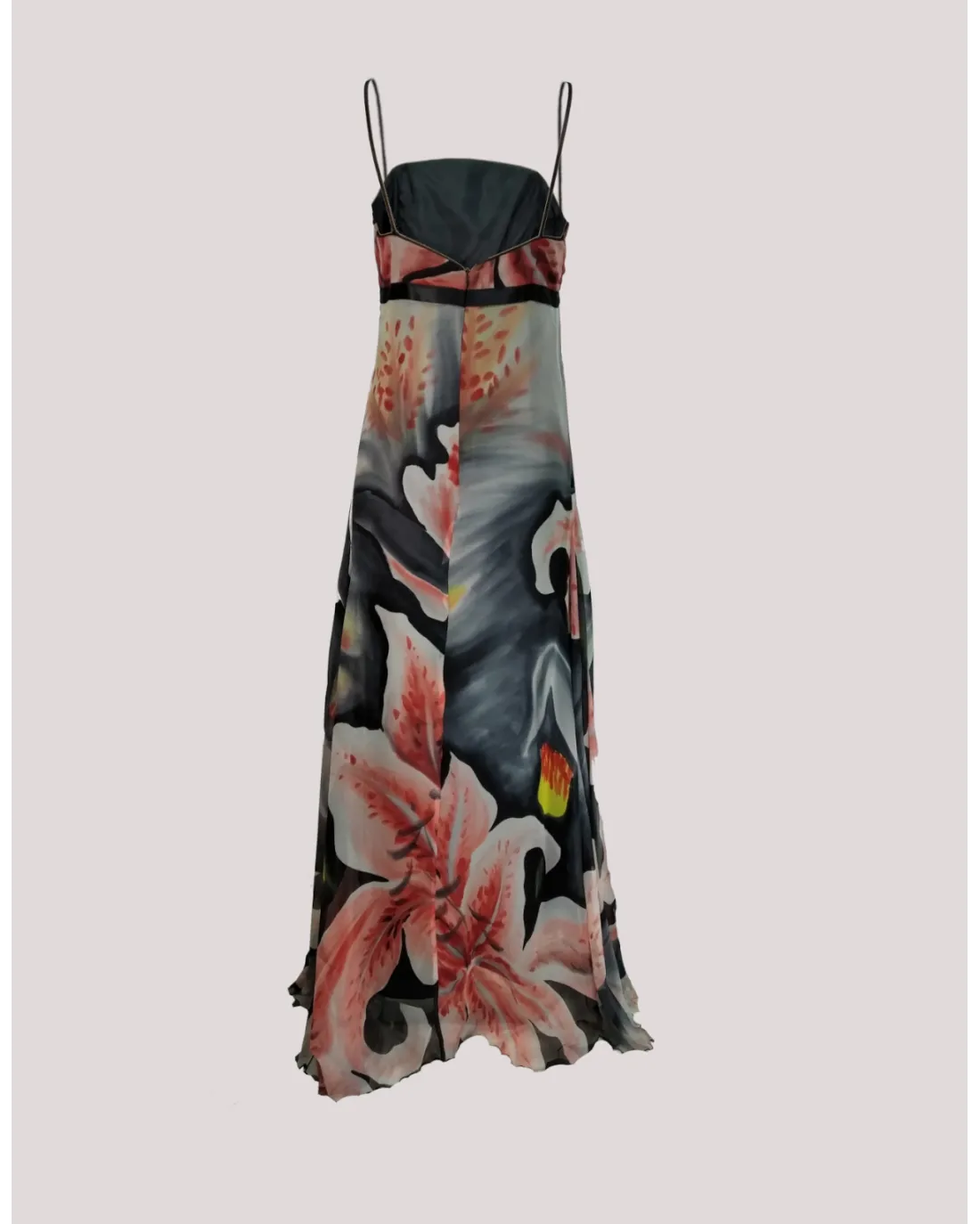 Vestido a media pierna confeccionado la parte de arriba tul bordado con manga 3/4 y espalda acabada en lágrima y cierra con un botón en el cuello. Cortado a la cintura el vestido cuenta con una cinturilla de pedrería y falda y pecho en tejido brocado.