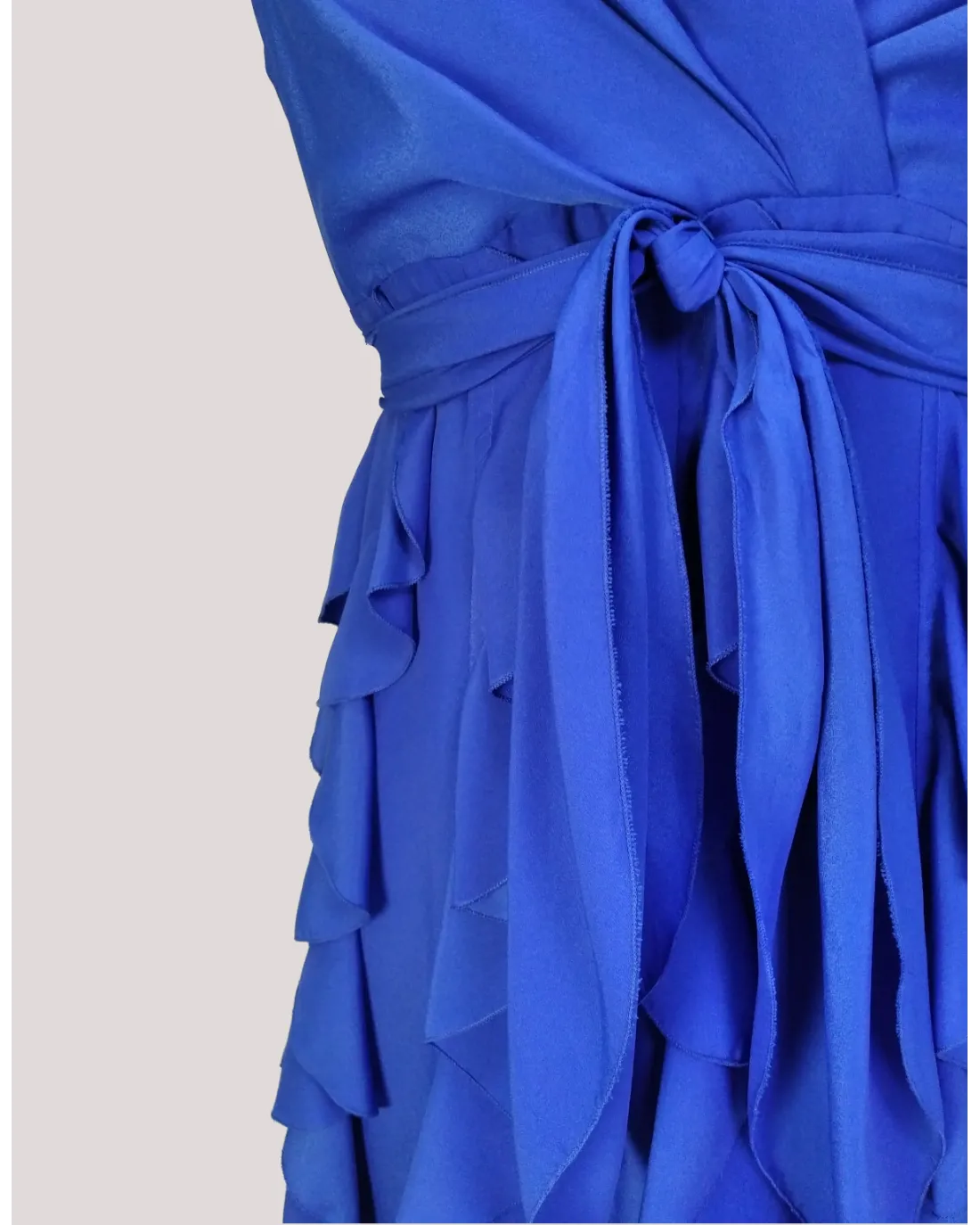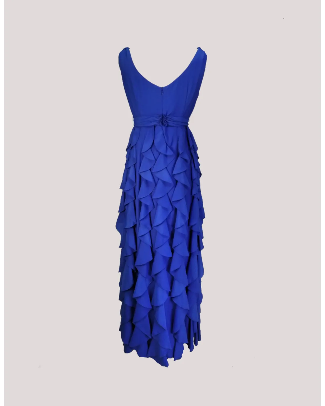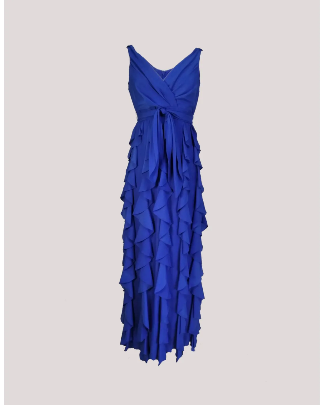 Vestido largo de tirantes con escote en V lazada debajo del pecho y falda larga con volantes.