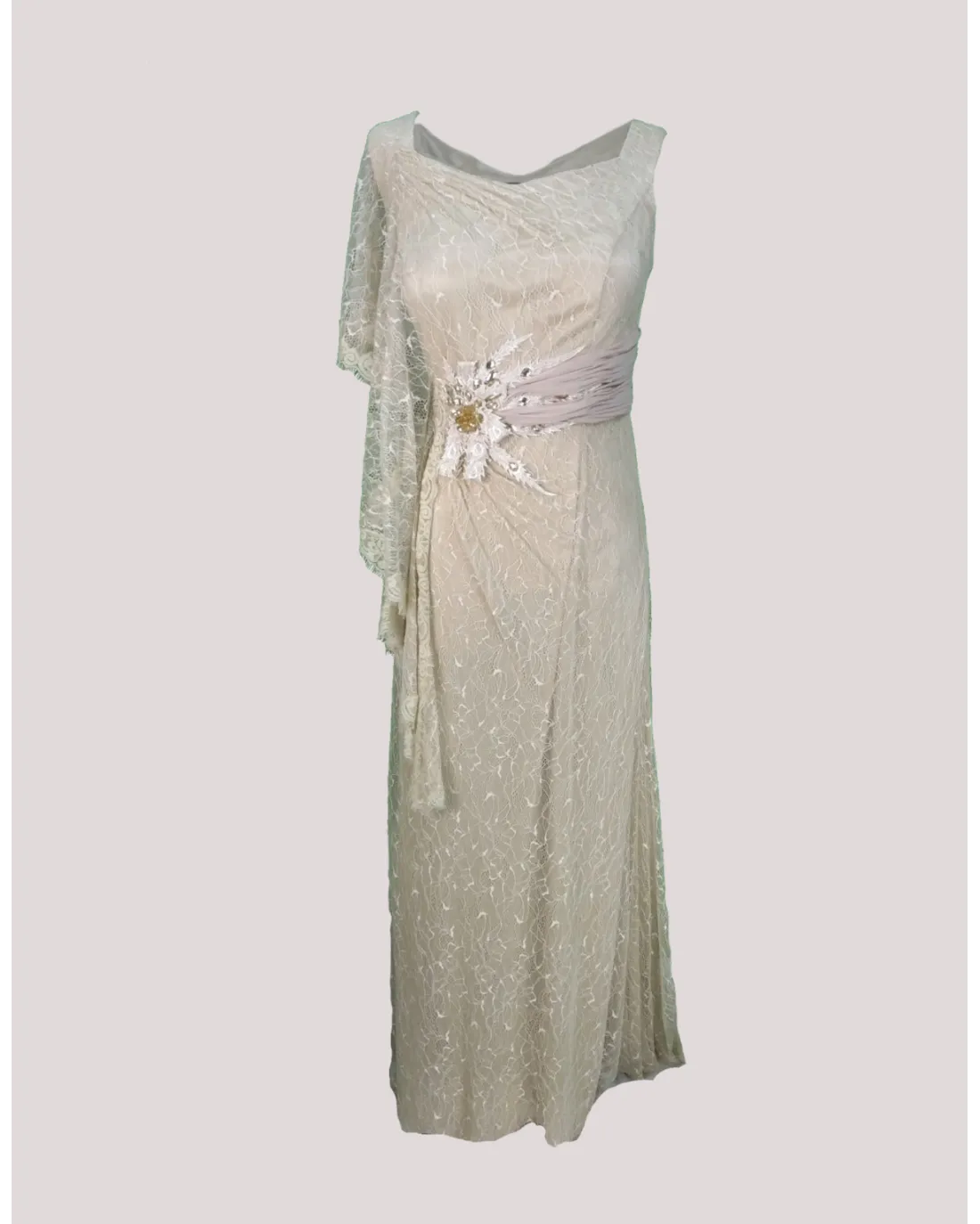 Vestido largo confeccionado en encaje de tirantes donde sale un volante y con drapeado en la cintura y aplique floral en un lateral.