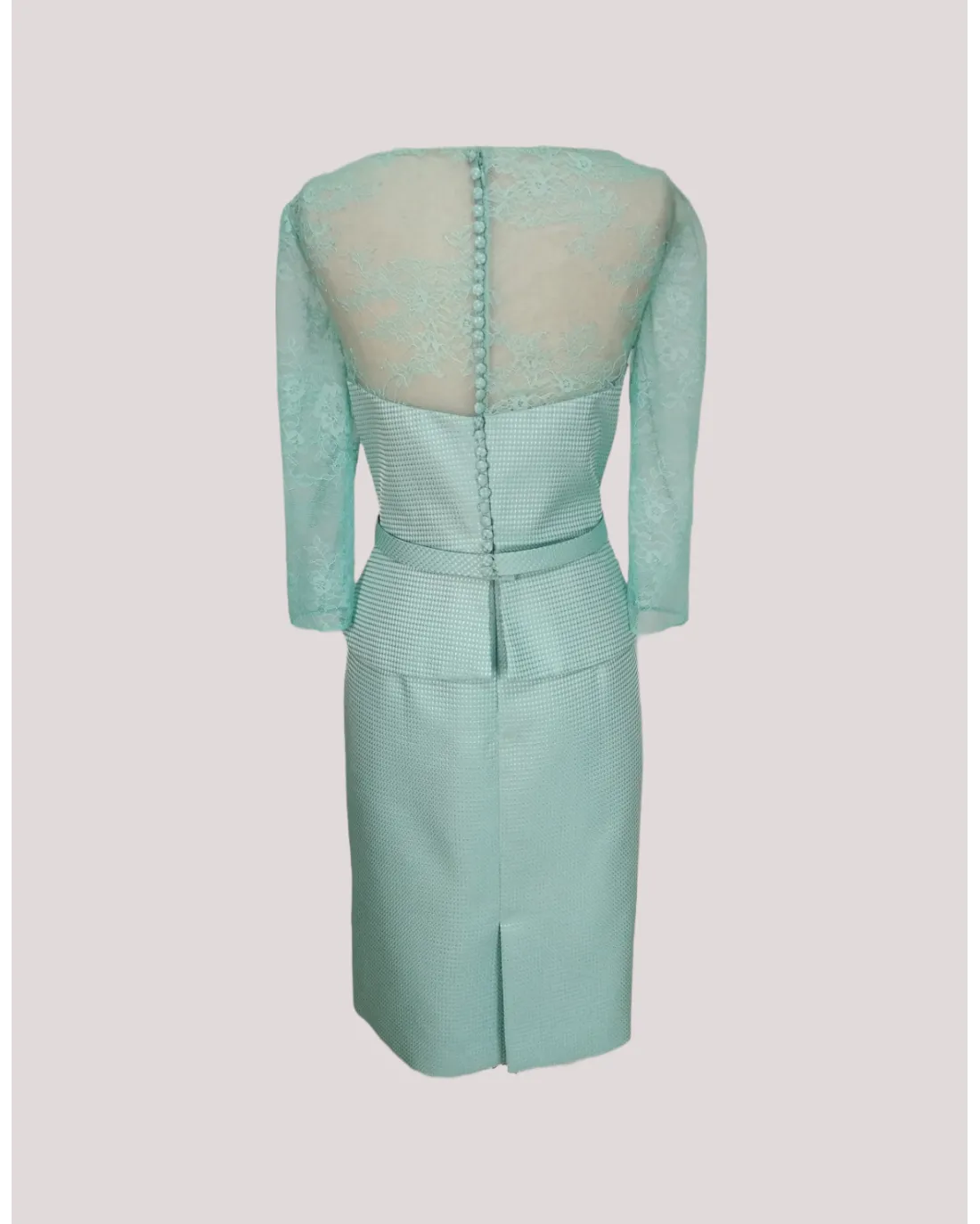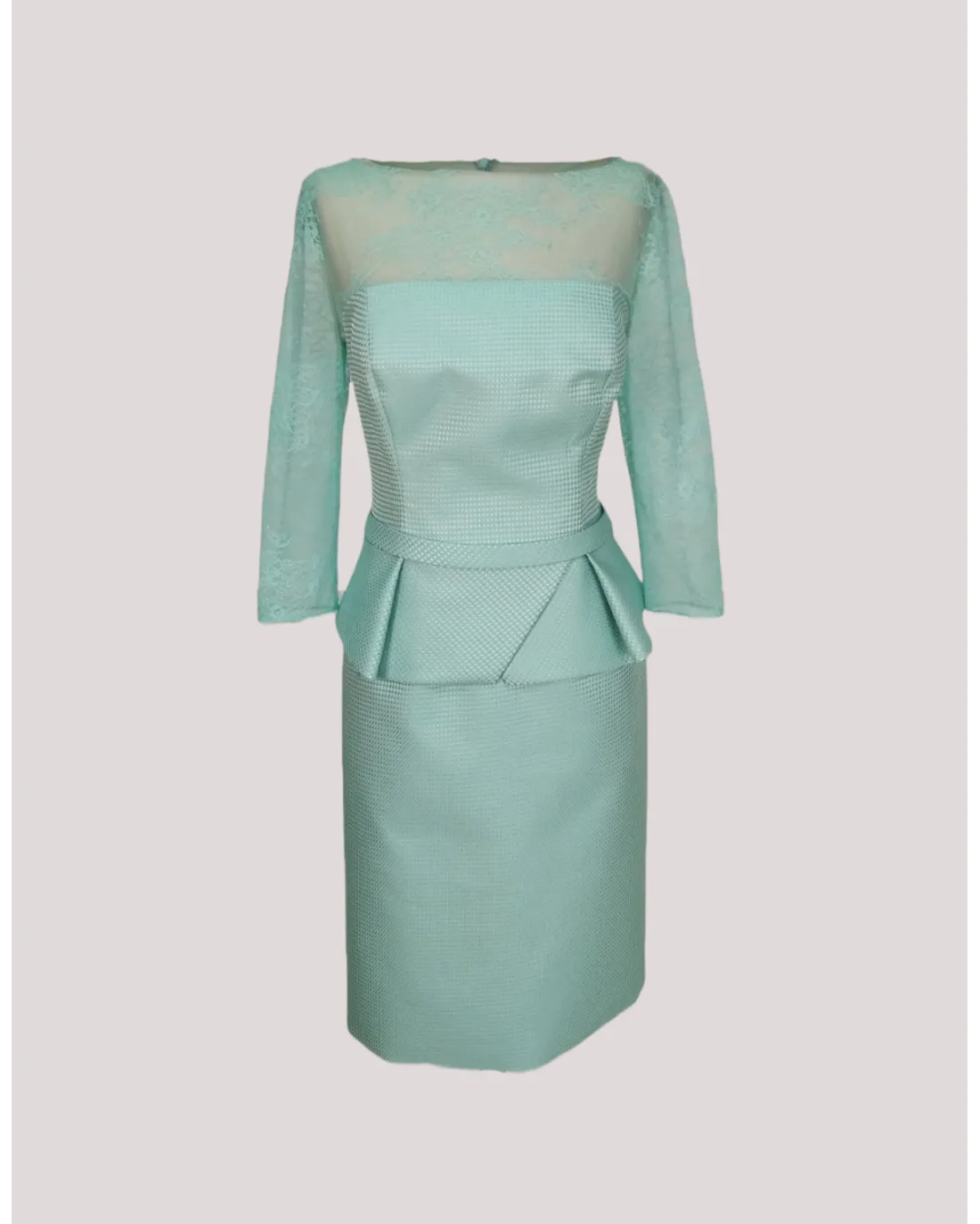 Vestido corto, manga larga con escote en pico y drapeado. Falda de tul con flores bordadas. Incluye fajín.