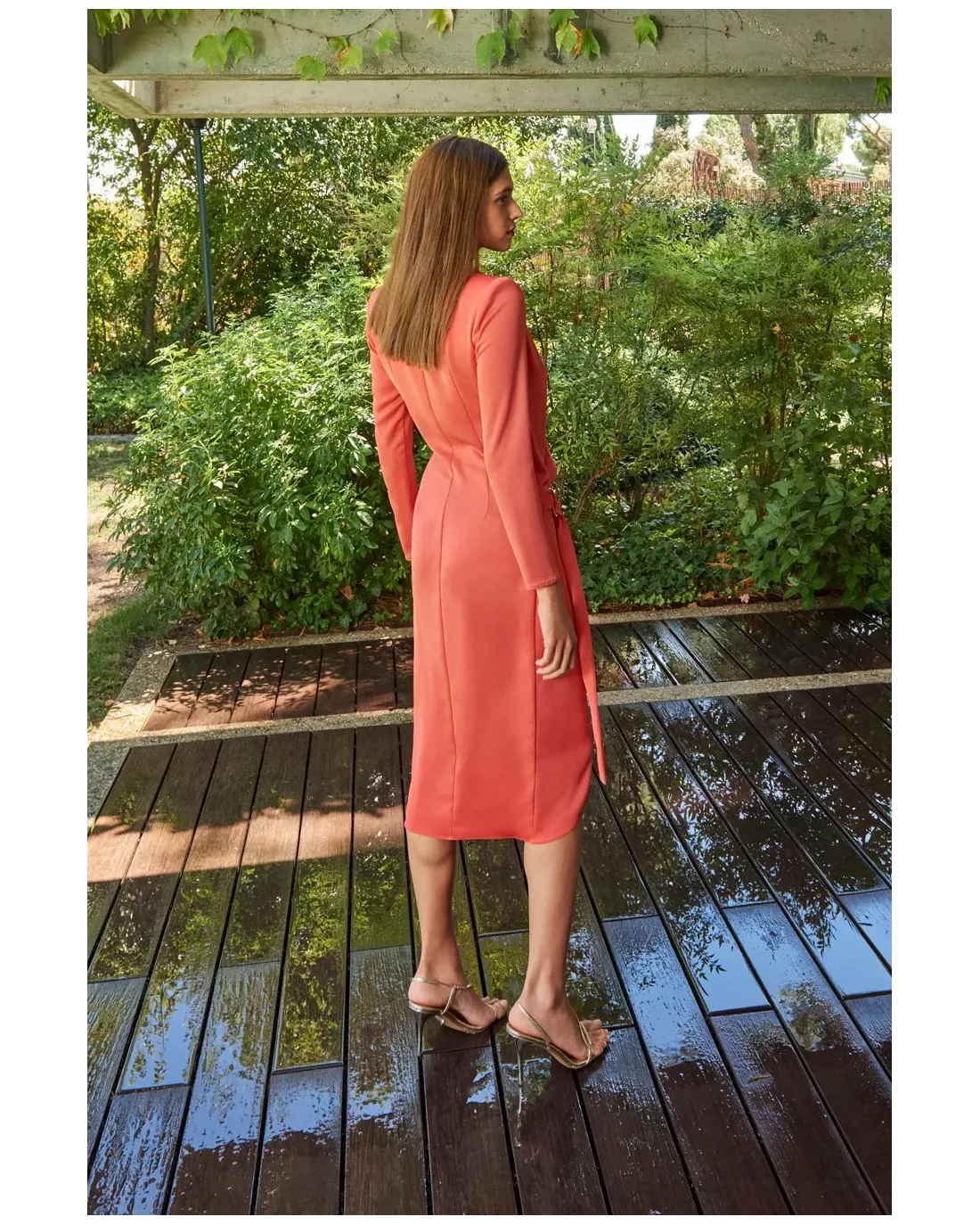 Vestido de largo midi con escote redondo, maxi hombreras, cortado a la cintura y abertura trasera.