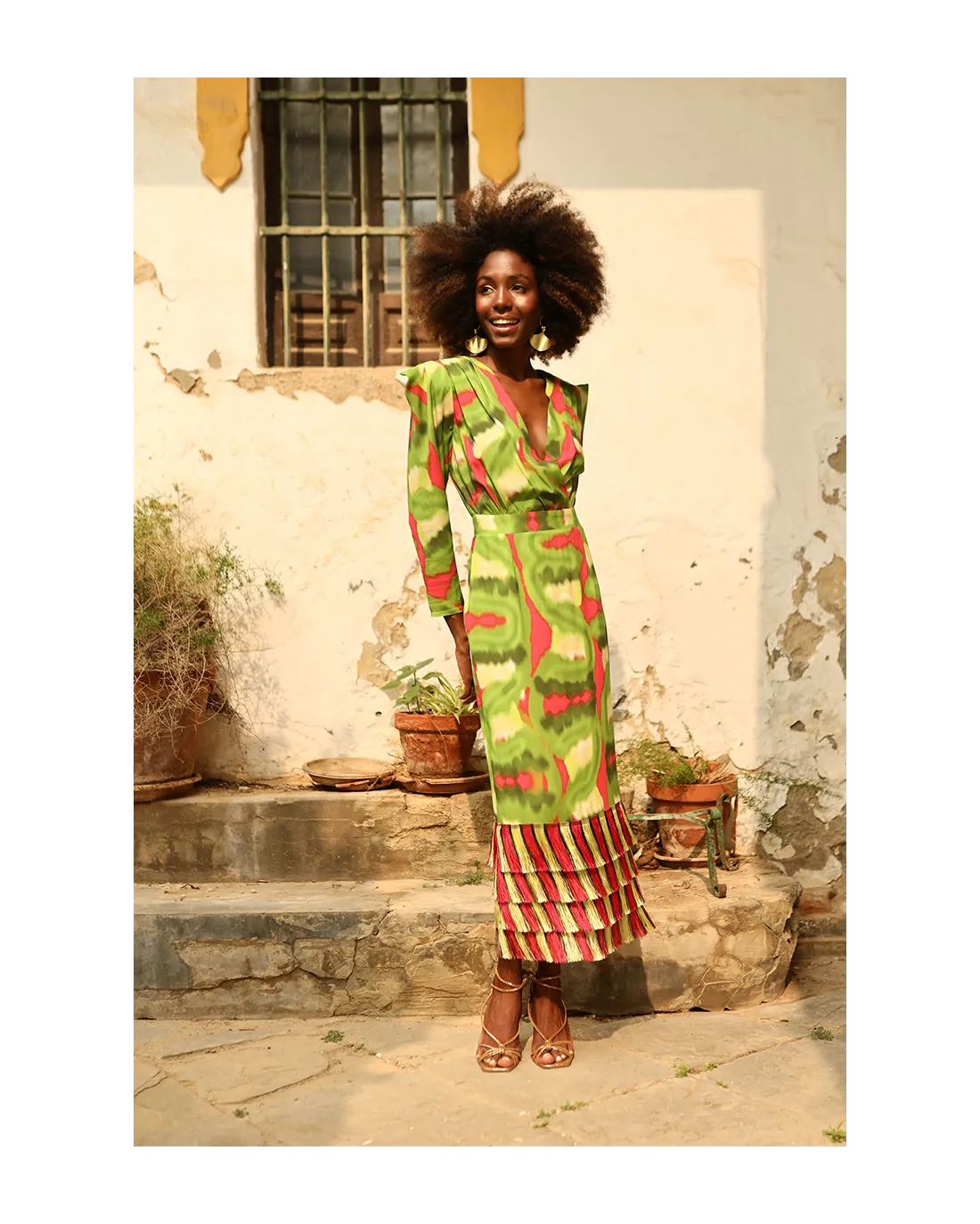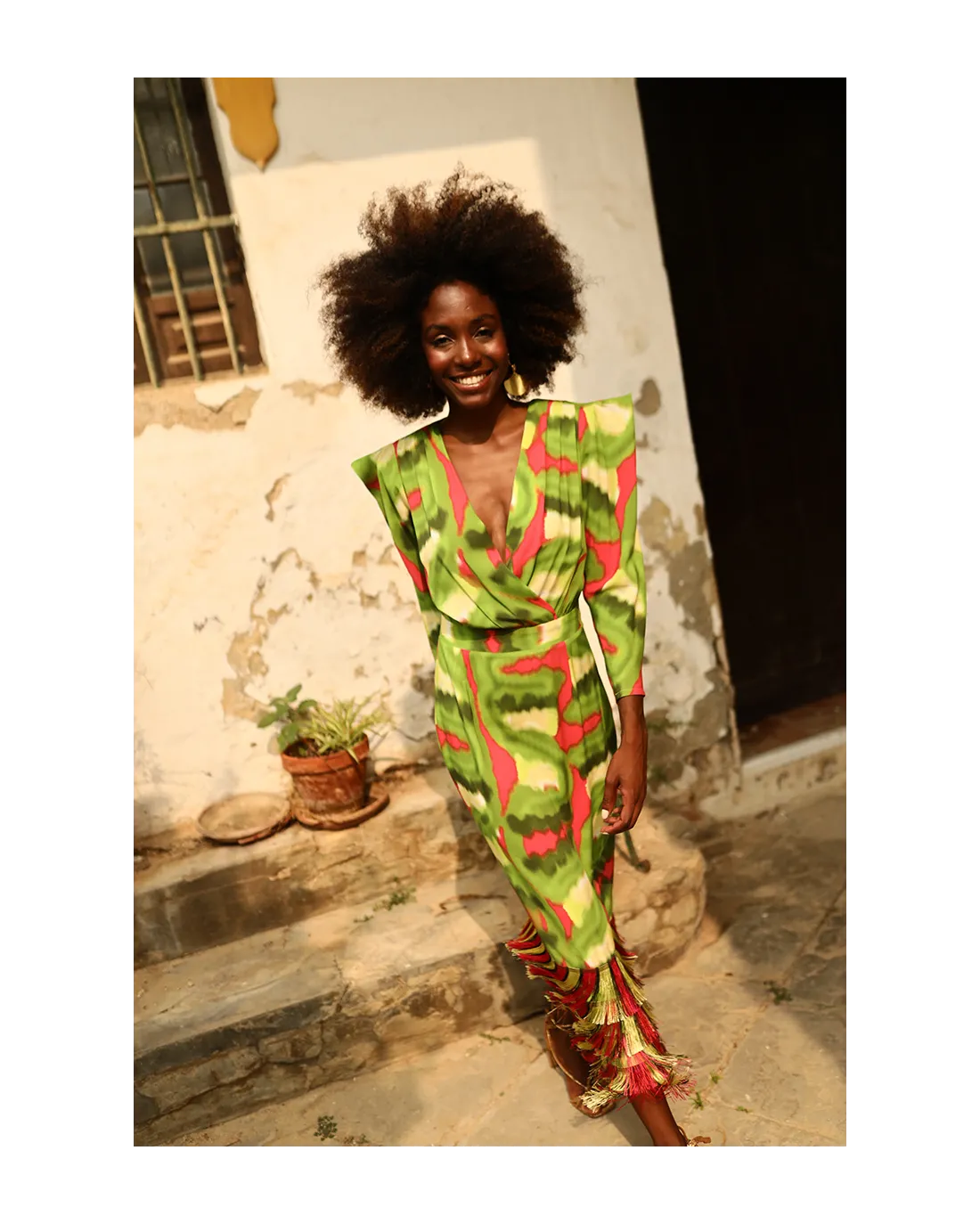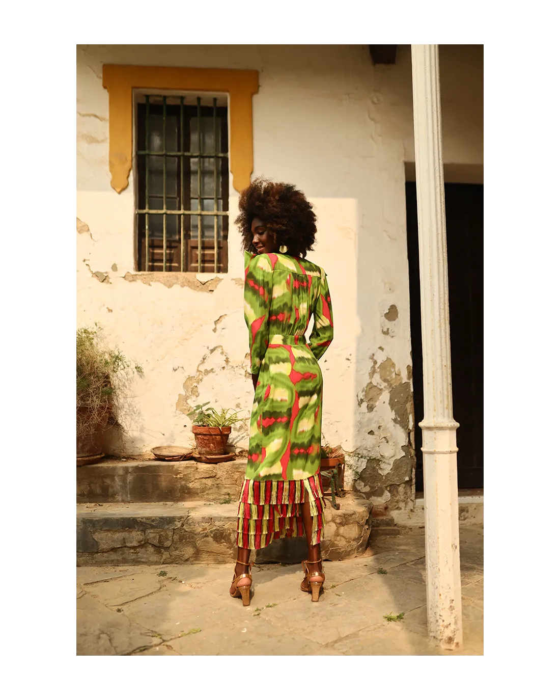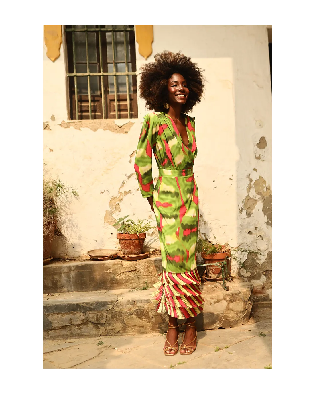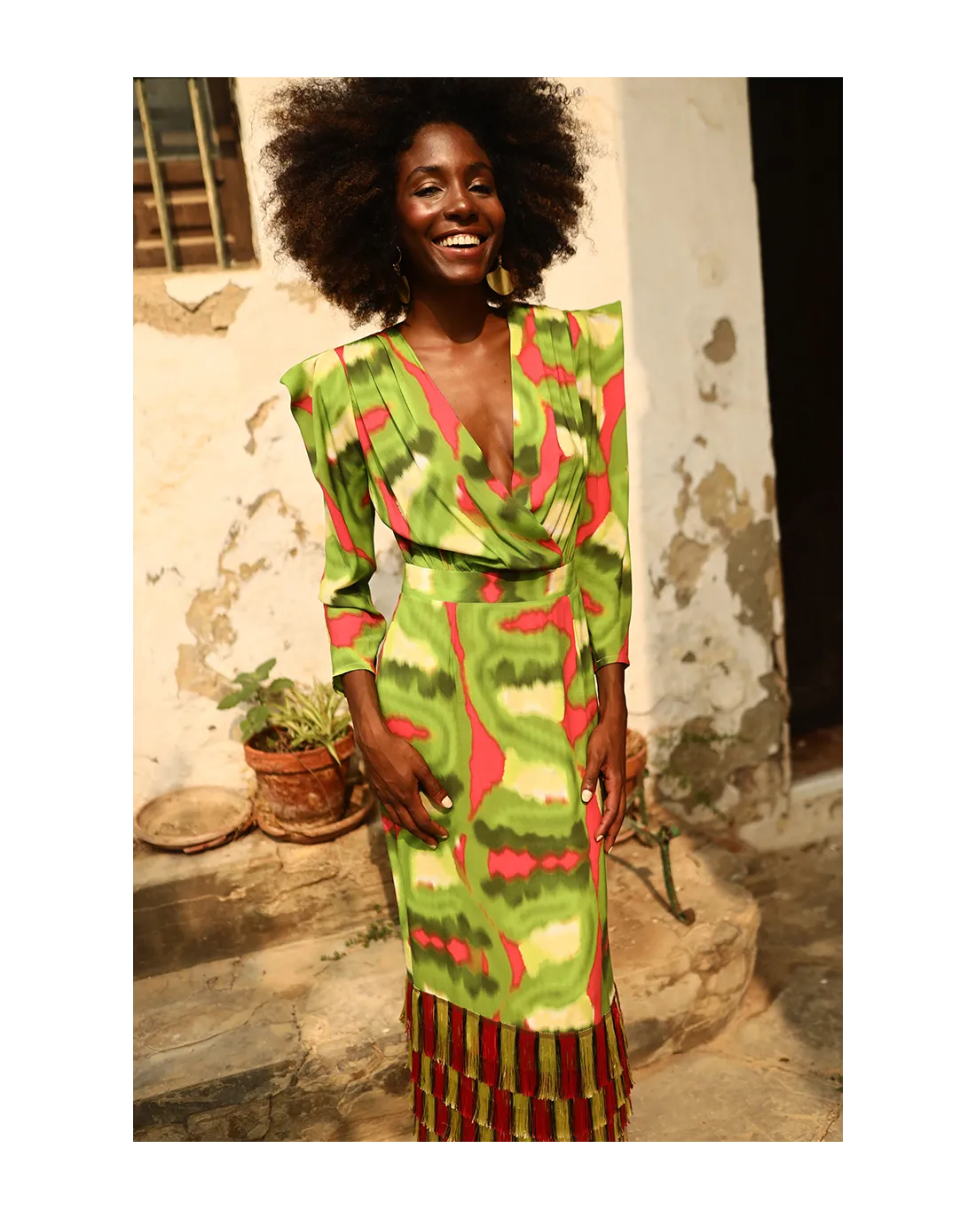 Vestido corto manga larga con espalda drapeada, bicolor.