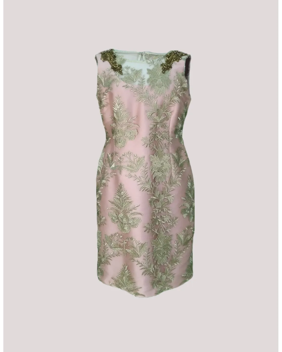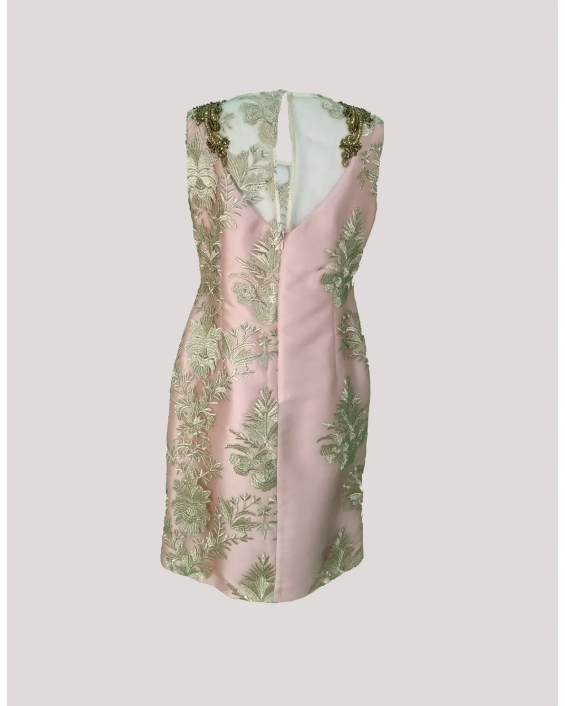 Vestido corto bordado en tul, de hombros anchos y apliques de pedrería en hombros.