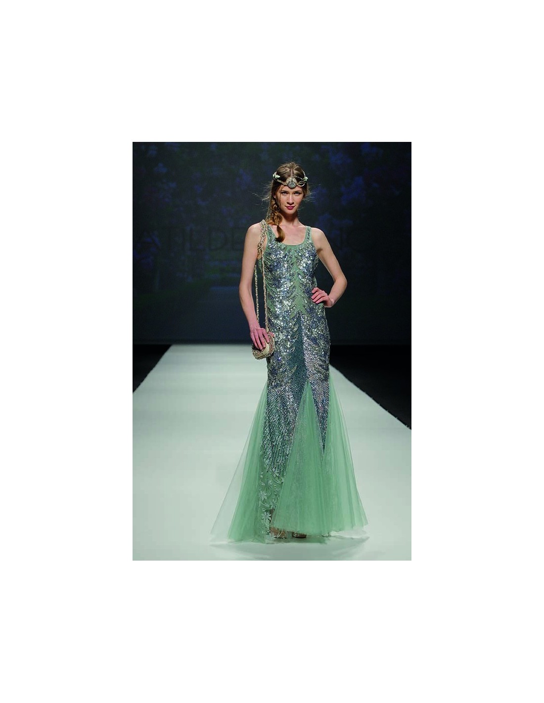 Vestido largo confeccionado en tul bordado en pedrería, de manga corta, escote en V y cierre en espalda con cremallera invisible. Chaqueta NO incluida.