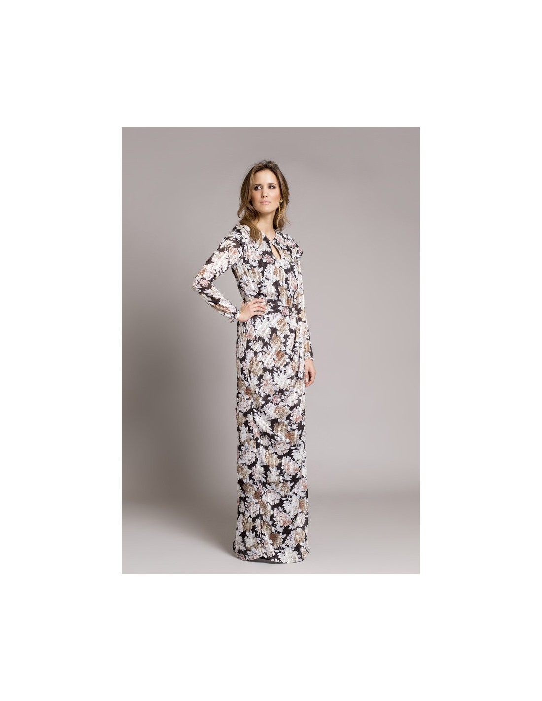 Vestido largo estampado con manga larga que salen de unos pliegues en hombros y una abertura trasera.